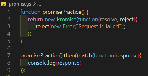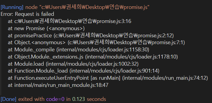 콜백 함수의 인자 reject을 위와 같이 실행하면 실패 상태이다.