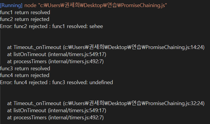 func2와 func4에서 에러가 발생한 것을 확인할 수 있고 func3의 파라미터가 undefinded인 이유는 func2의 에러가 발생한 Promise 객체를 반환받았기 때문이다.