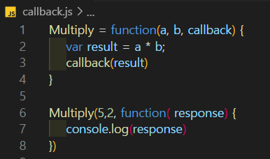 Mutiply 함수의 매개변수로 a, b, callback(함수)을 받는 것이고 6번째 라인에서 함수를 호출한다. 이때 a = 5, b = 2가 되어 5*2=10의 값이 result 변수에 담긴다. 그리고 callback 함수에 result값을 넣어 호출하므로 result값이 response에 담긴다. 따라서 출력할 시 10이 출력된다.